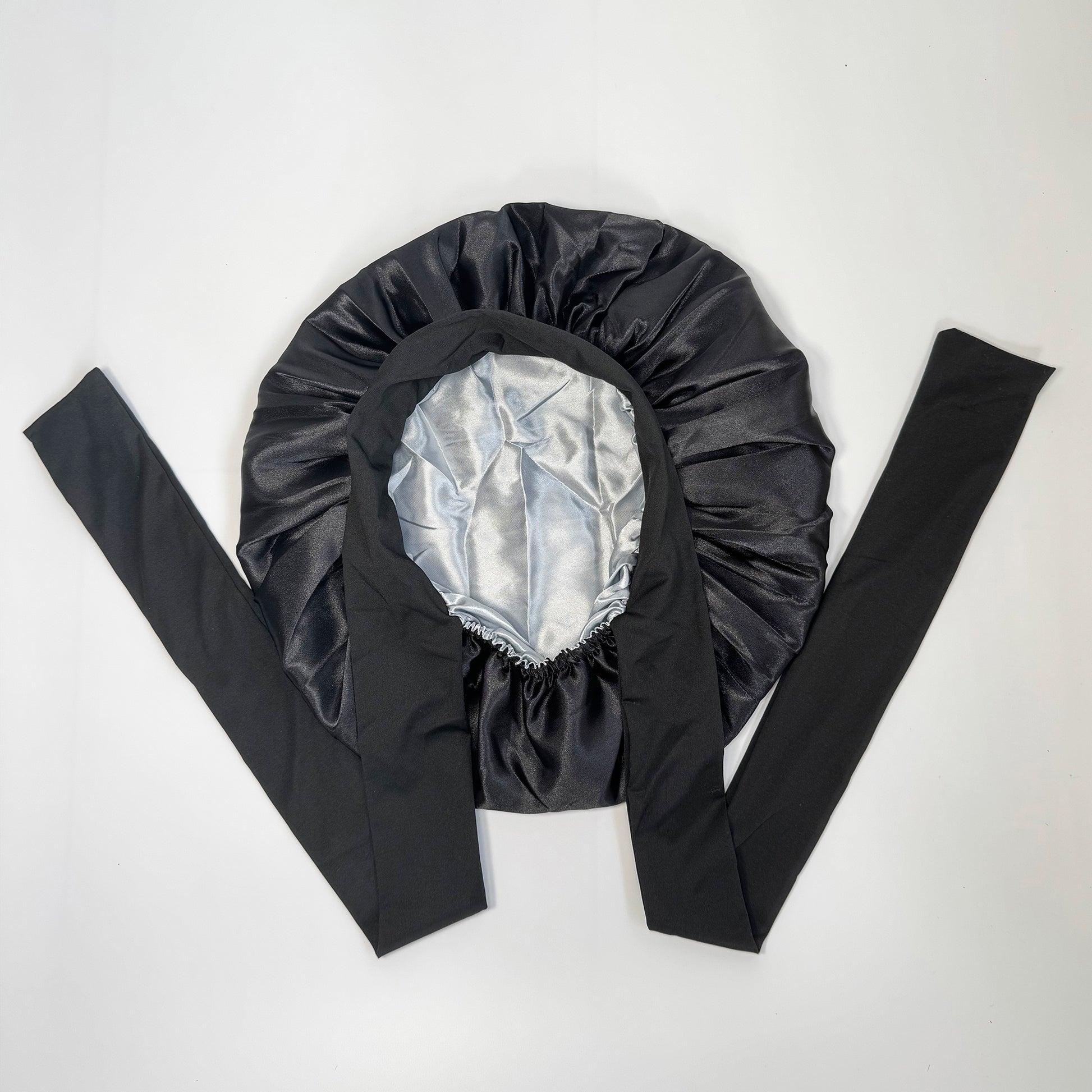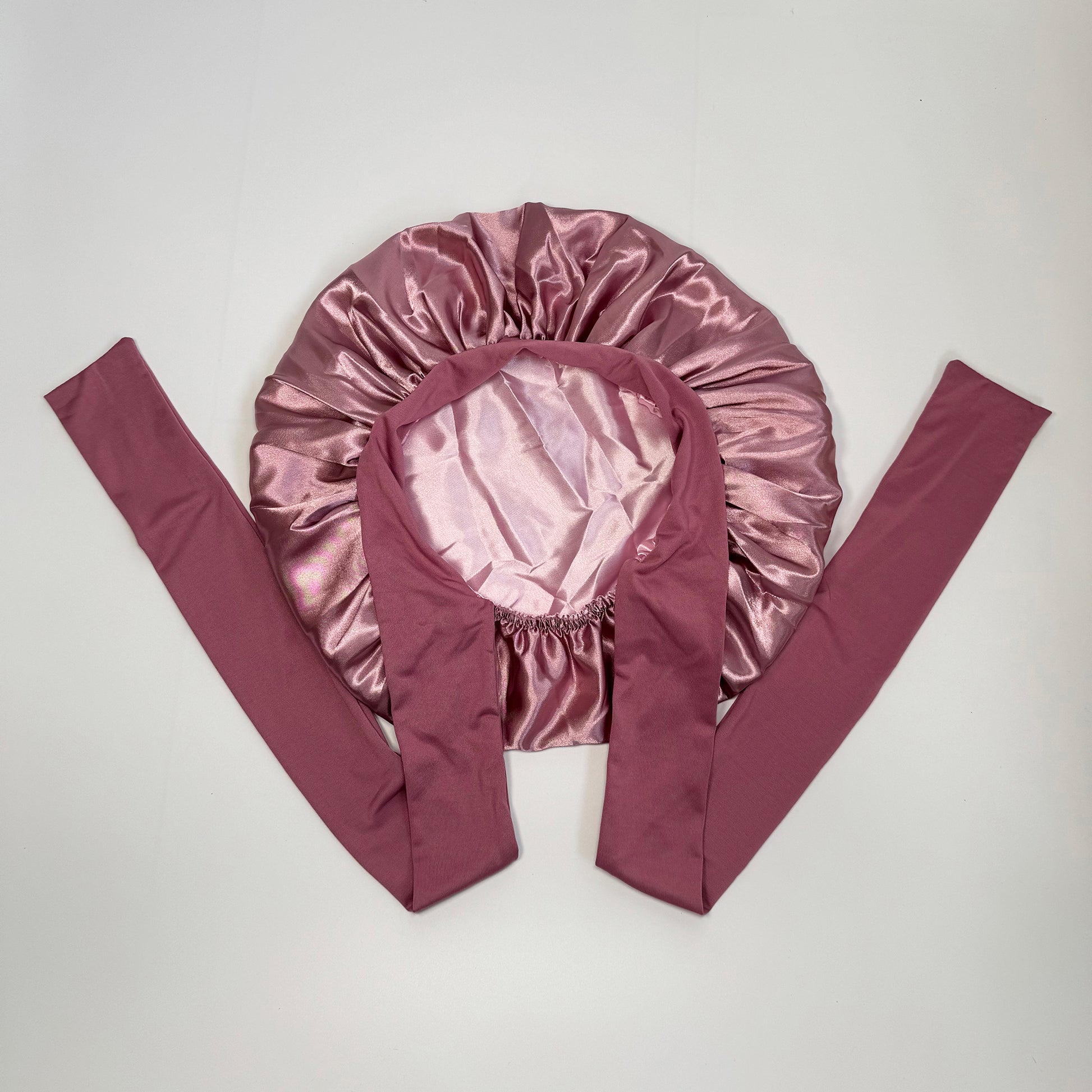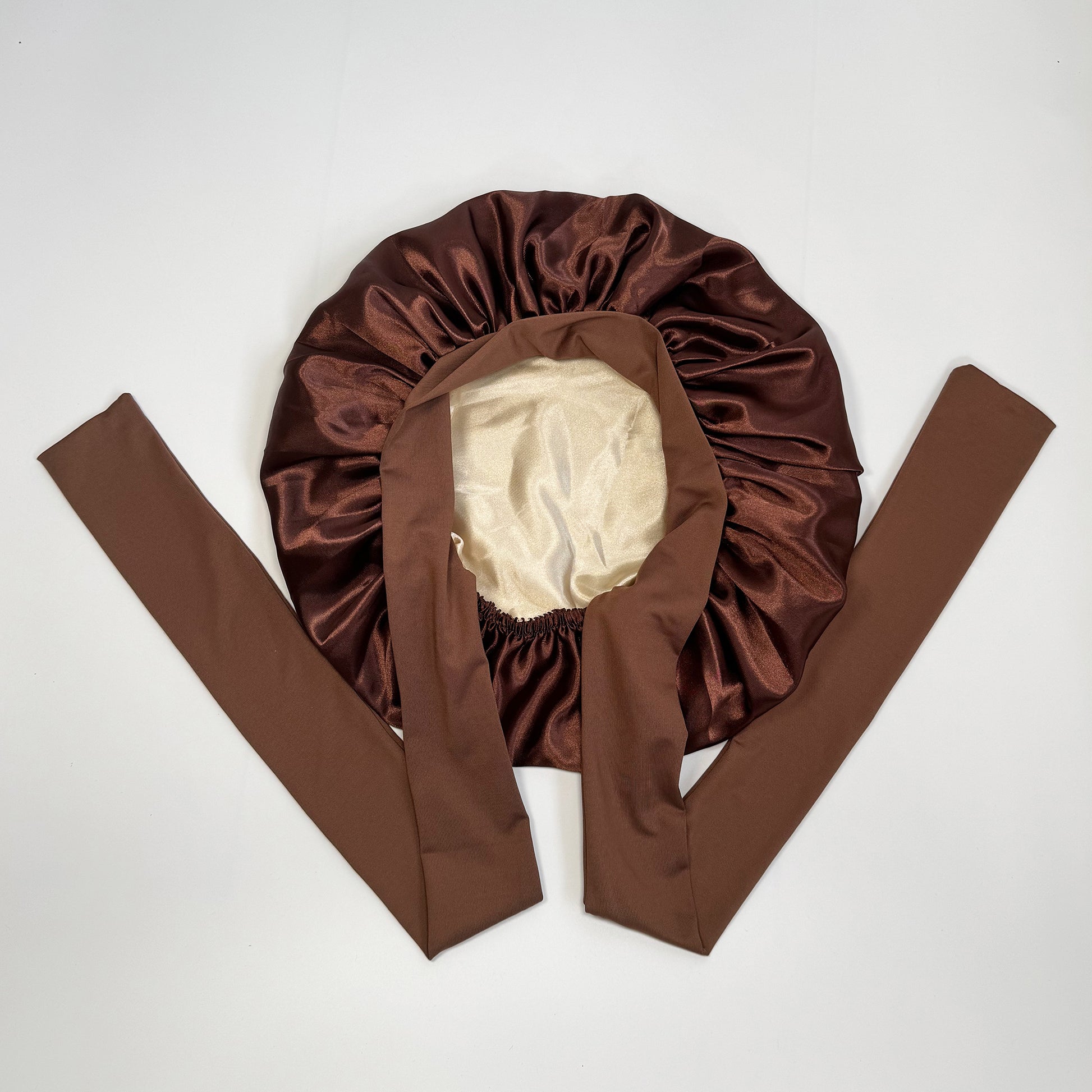 Our satin bonnet features a premium double-layer design with two beautiful colors inside and out. Measuring 38 cm (approximately 15 inches) in diameter, it comes with a wide, stretchy band that stays comfortably and securely on your head. We recommend hand washing it with cold water and gentle soap to maintain its quality.